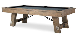 The Isaac Pool Table boasts steel turnbuckles, solid oak angled legs, and finger-jointed rails that make it a stunning addition to any game room. The Silvered Ash finish is a combination of Grey tones that creates a one-of-a-kind finish. Its durable construction includes a 1", 3-piece slate for superior gameplay. With the optional choice of a matching solid wood dining top, this table can easily transition from a pool table to a dining table for any occasion. Available in both 7' and 8' sizes.