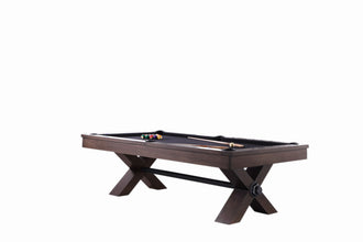 Crafted by experts and inspired by modern industrial design, the Plank & Hide Vox Wood Pool Table features a sturdy wood X-leg construction with oversized bolts and a modern styled black stretcher. The refined simplicity is enhanced by a durable Grey Walnut finish, making it the ideal addition to any stylish game room or contemporary home. This high-quality table comes equipped with a 1" 3-piece slate, ensuring durability and optimal performance.