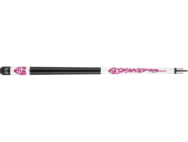The Athena Junior 52" Heart cue features a Pink heart with tribal smoke up the forearm with matching designs on the sleeve. This cue is a wrap-less cue with a glossy black handle.