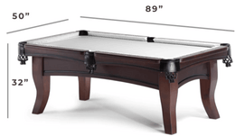 The Silver Accessory Kit comes with 2 two piece cues, ball set, bridge cue, table cover, chalk, wall rack, tally balls and cup, ball racks, table brushes and 6 cue wall rack.