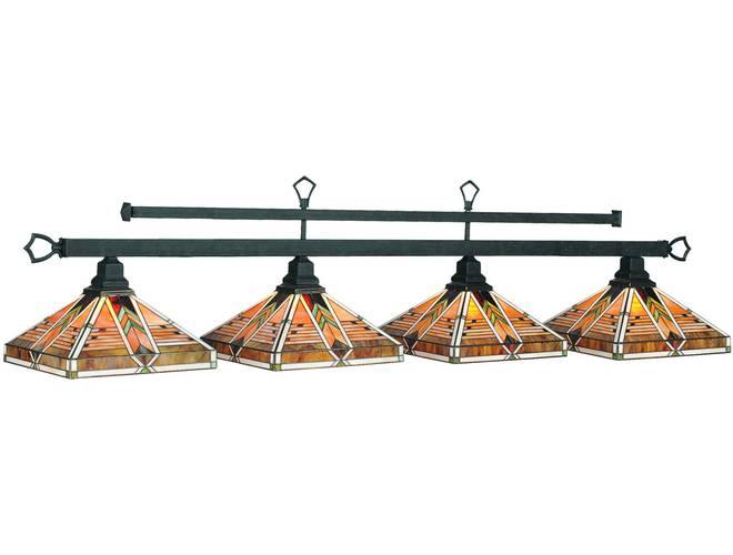 This elegant 4-lamp pool table light is inspired by Frank Lloyd Wright's Tree of Life design. A beautiful craftsman-style light with espresso finish, the design brings stately beauty to the room and the design will certainly catch the eyes of guests. Each stained glass shade has soft yellow, brown and pale green colors which really stand out against the matte black finish on the light bar.