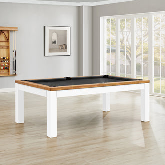 The Penelope II offers a sophisticated update to the original’s sleek design, featuring a slimmer, more graceful profile. Its sturdy solid post legs, wooden frame, and steel support beams deliver exceptional stability. Equipped with an accurate slate-leveling mechanism, it guarantees a perfectly flat playing surface. This model has a two-tone finish - solid white body with Acacia rails/dining top. The Acacia dining top effortlessly transforms the pool table into an elegant dining area. Each Imperial pool table is masterfully crafted and thoughtfully designed by billiards connoisseurs and enthusiasts. This comes with the Imperial Essential Play Package, which includes everything you need to get started!