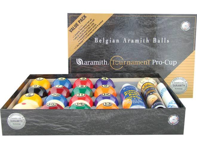 The Pro-Cup Tournament Value Pack by Aramith features Duramith Technology which extends the life of the balls up to 8 times longer than regular polyester Billiard balls. In addition to the Tournament Ball set, the Value Pack includes The Jim Rempe training ball, Pro-Cup cue ball, Aramith Liquid Ball cleaner and the Micro-Fiber cloth. A great value for one of the best ball sets in the industry.