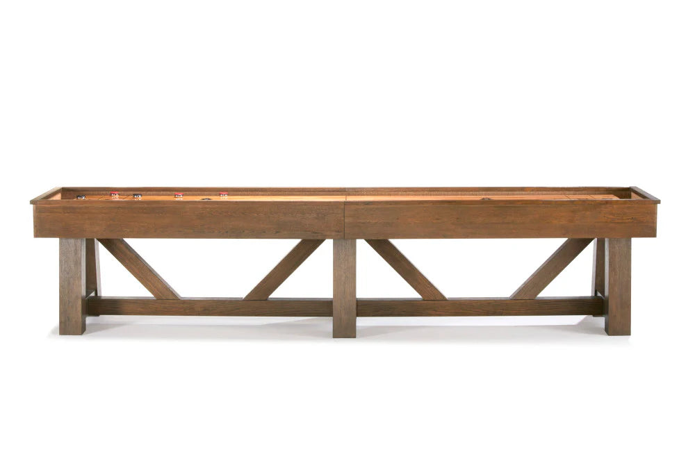 A perfect complement to the Botanic Billiard Table, the matching 12' Botanic Shuffleboard Table completes the rustic yet contemporary aesthetic of your game room. Available in either a Dark Charcoal or Rustic Dark Brown finish, this 12' table will provide hours of enjoyment for your family and friends. This includes four black weights, four red weights, embedded abacus scoring system, board sweep and shuffleboard wax. This comes in a Dark Charcoal finish, but is also available in the Rustic Dark Brown.