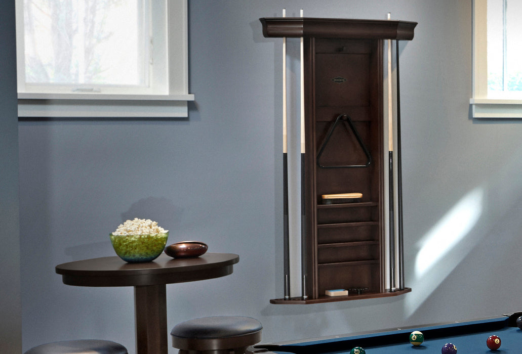 This closed-back transitional wall rack boasts a stunning Louis-Philippe style angled header panel, giving it a timeless and elegant appearance. Utilizing the standard Brunswick wall mounting system, this rack offers secure and sturdy support. Assembly is required, but once completed, it can conveniently hold all the necessary items for a complete play package (items sold separately) including up to eight cues, an 8-ball rack, 9-ball rack, a set of billiard balls, a brush, and chalk.