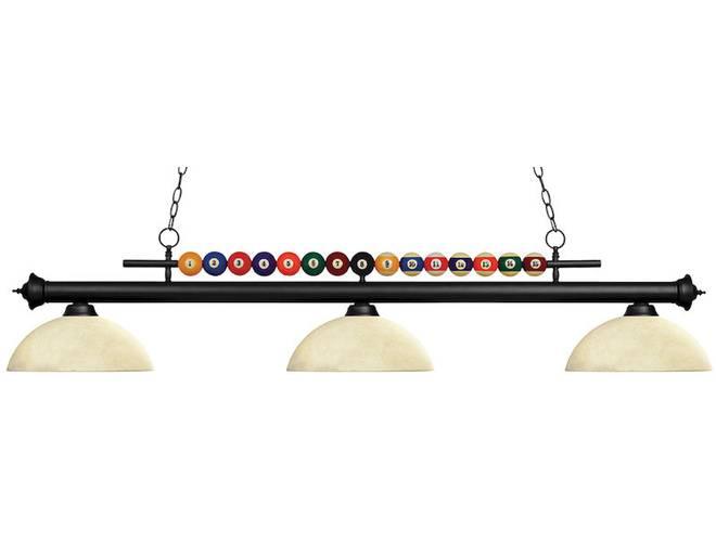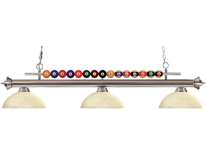 Playful pool ball motifs best describe this beautiful three light fixture. Finished in Brushed Nickel and paired with Dome Golden Mottle glass shades, this three light fixture would be at home in the game room. 72 inches of chain per side is included to ensure the perfect hanging height.